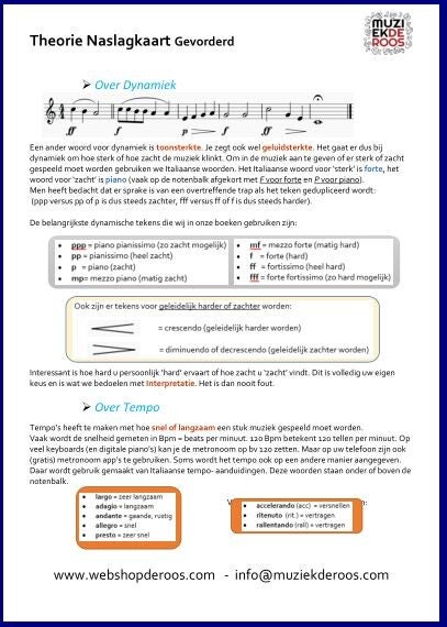 Met onze Theorie Naslagkaart Basis hebben we geprobeerd om alleen de theorie die onmisbaar is in de cursus (zoals herhalingen, kruis en mol, verbindingsbogen etc) uit te leggen. Er is ook een Theorie naslagkaart Gevorderd die een verdieping geeft in de muziektheorie.