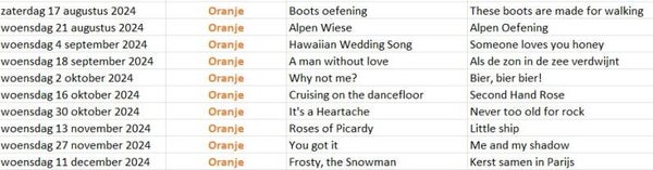 U krijgt via de mail toegestuurd een Excellijst (zoals u op de afbeelding kunt zien, maar dan met uitzendlinks) met daarop alle Muziekuren van de geselecteerde kleur vanaf de Zomerstop 2024 tot de Winterstop op 15 december.