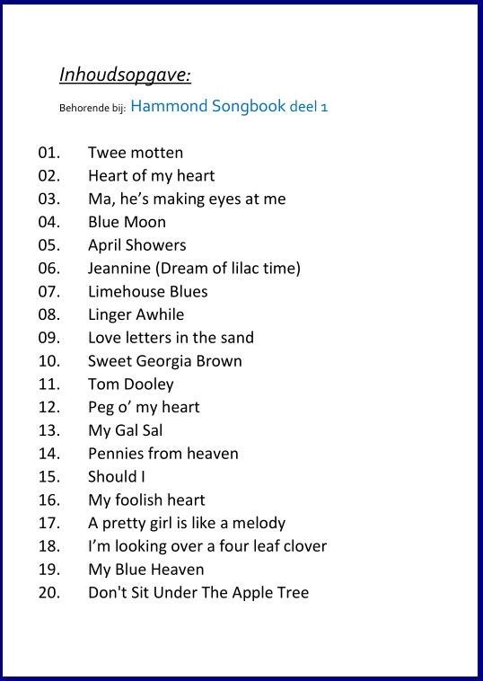 Iedereen heeft wel eens gehoord van een Hammond orgel. Mateloos populair eind vorige eeuw bij het grote orgelminnend publiek en nog steeds zijn er vele mensen die deze muziek een warm hart toedragen. Hammondsongs kenmerken zich door hun afkomst uit film, theater en shows maar ook door de typische Hammond sound. En deze klank zit nog steeds op ieder keyboard maar het wachten was op geschikte boeken met mooie swingende nummers.